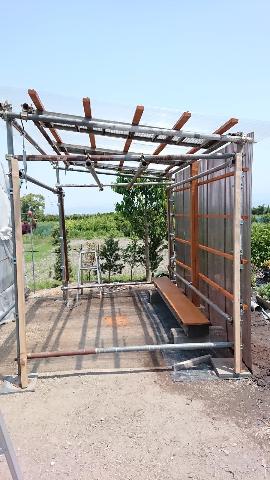 1方向だけ波板張りましたが、側面や後部は杉板を張って、側面は開閉式にしようと考えてます。